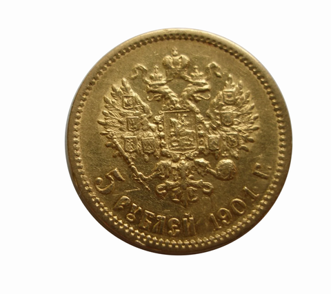 Реверс: В центре изображен Малый Государственный Герб Российской империи - двуглавый орёл, головы которого увенчаны двумя коронами, третья, большая корона над ними. Все они соединены орденской лентой ордена Св. Апостола Андрея Первозванного. На груди орла расположен Московский герб, в щите изображен Георгий Победоносец с копьем поражающий дракона. Вокруг щита цепь ордена Св. Апостола Андрея Первозванного. На крыльях изображены гербы: Царства Казанского, Польского, Херсонеса Таврического, Астраханского, Сибирского, Грузинского и герб соединенных княжеств Киевского, Новгородского и Владимирского — по 4 на каждое крыло. В правой лапе орла – скипетр, в левой – держава. Под ним слева направо изображены: номинал - надпись «5 РУБЛЕЙ» и дата выпуска «1901 Г.». По окружности канта имеются рельефные элементы, выполненные в виде зубцов.