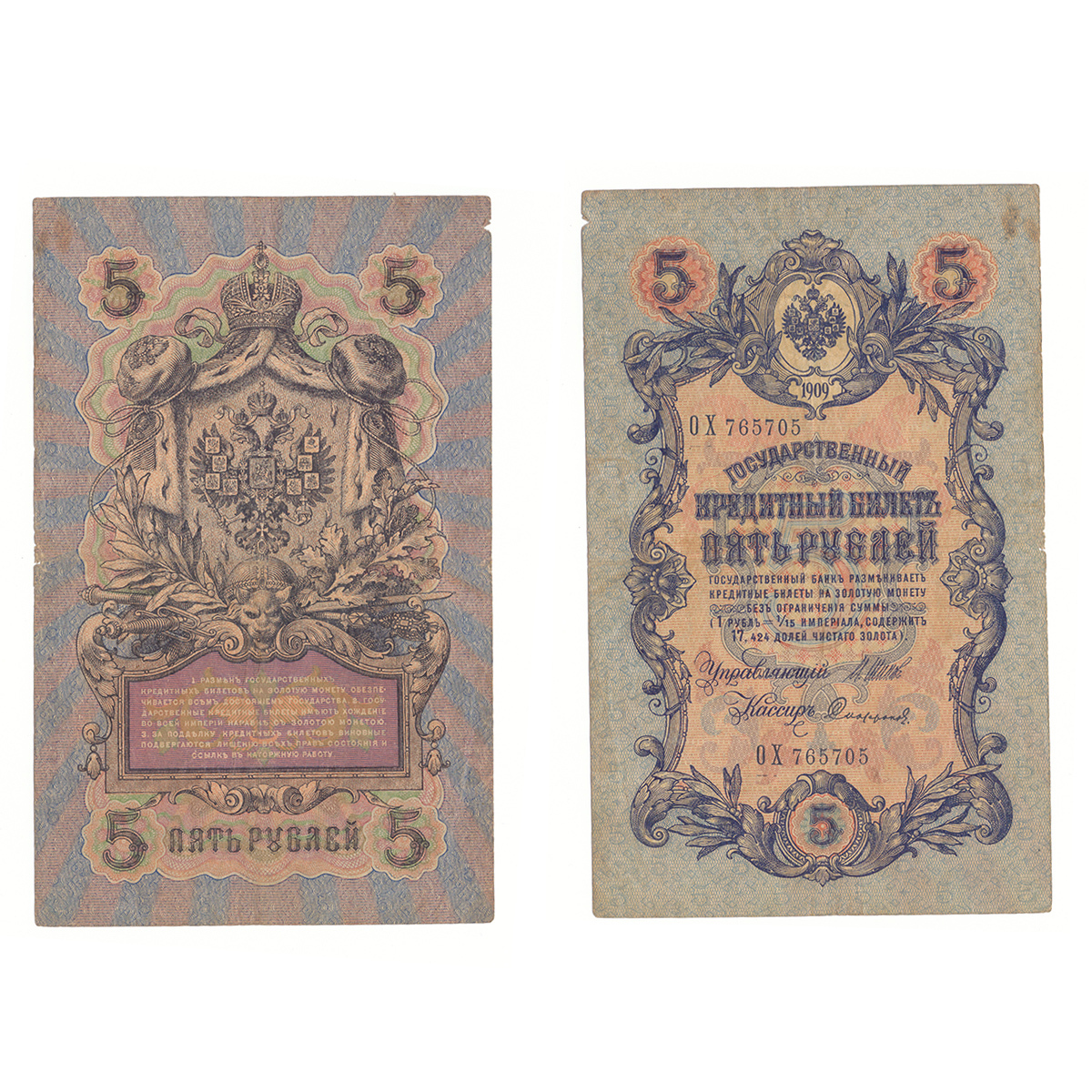 5 рублей 1909 г. Шипов Софронов. Царская Россия. Длинный номер №. Серия: -ОХ- F+