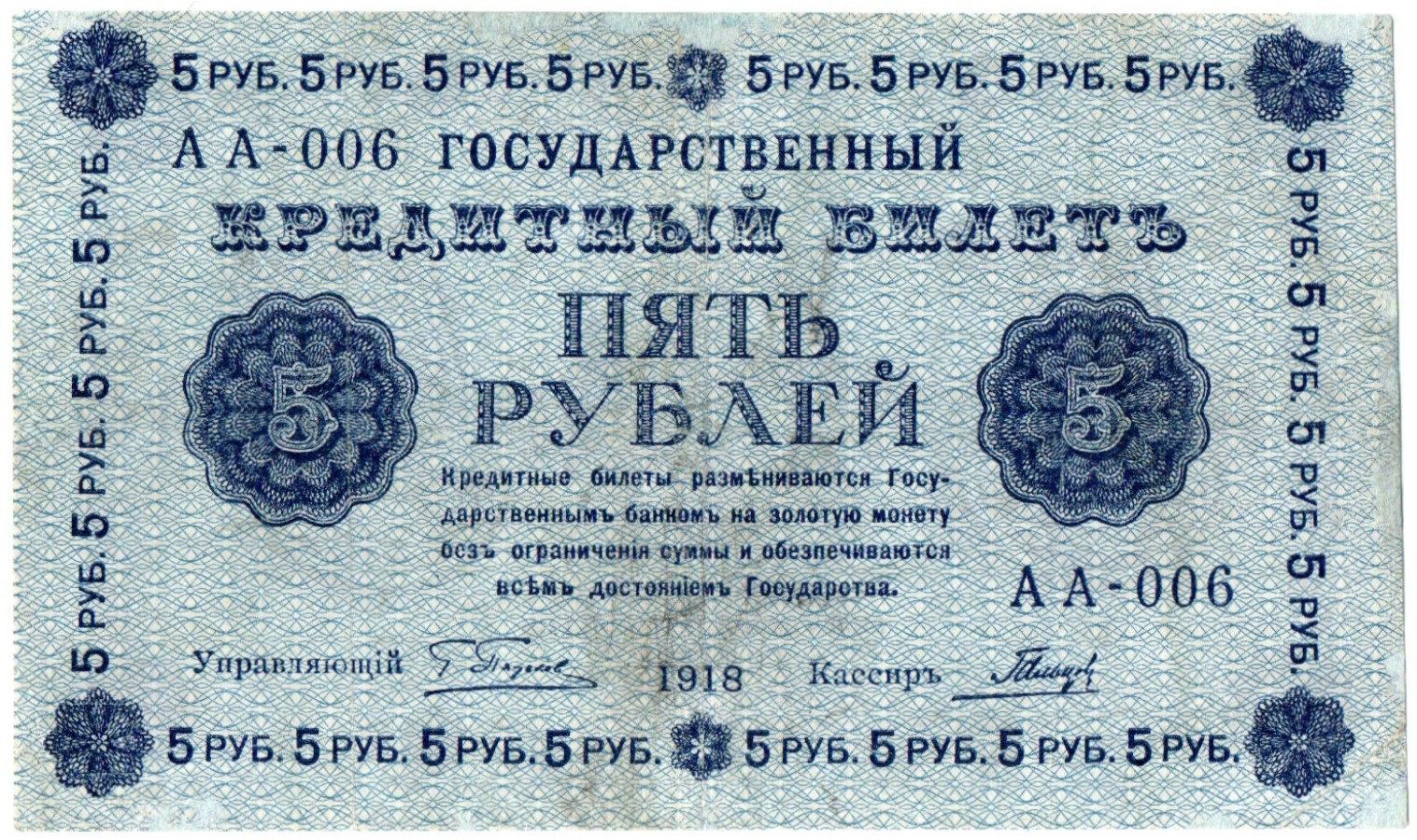 5 рублей 1918 г. Кредитный билет РСФСР. АА-006