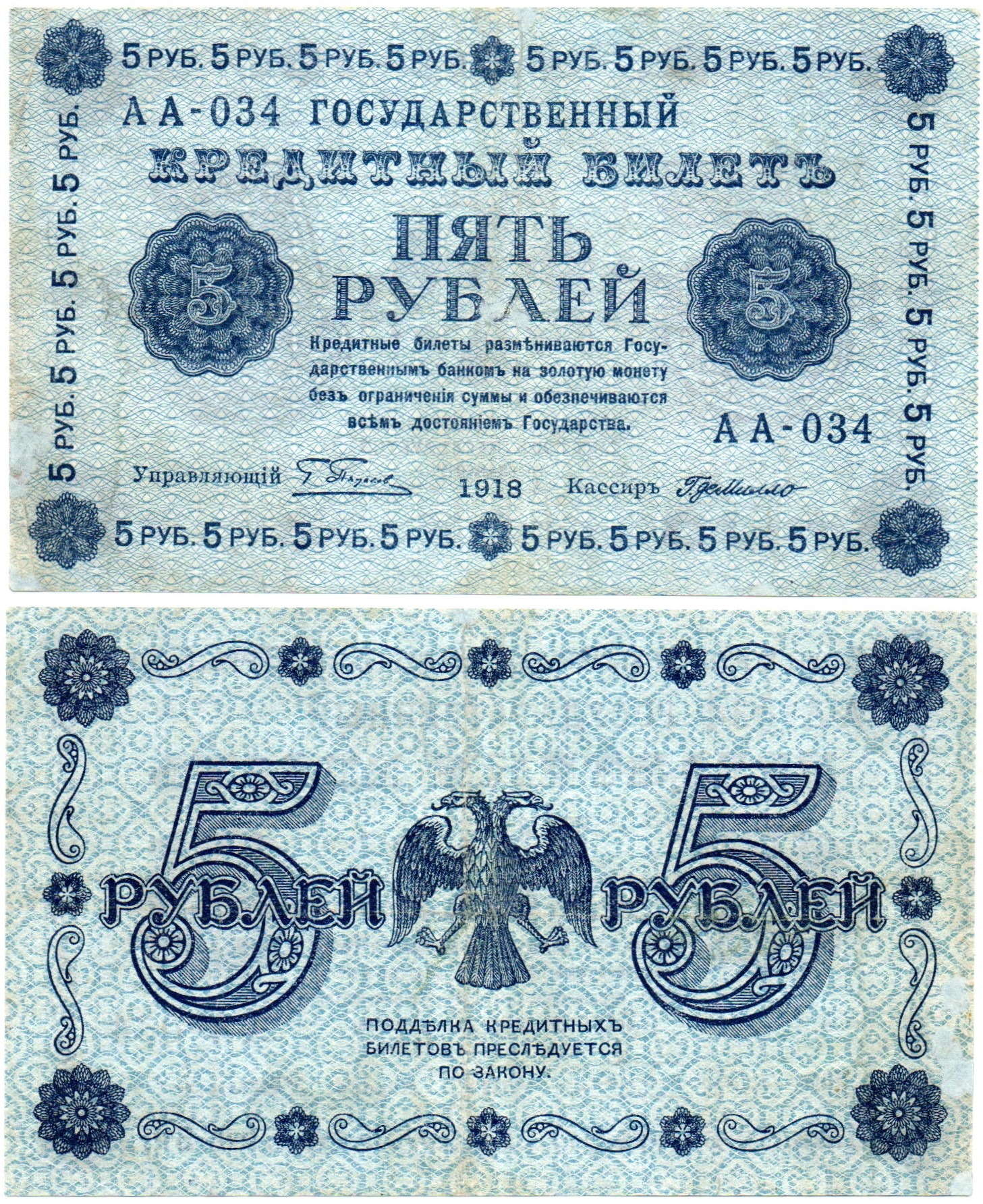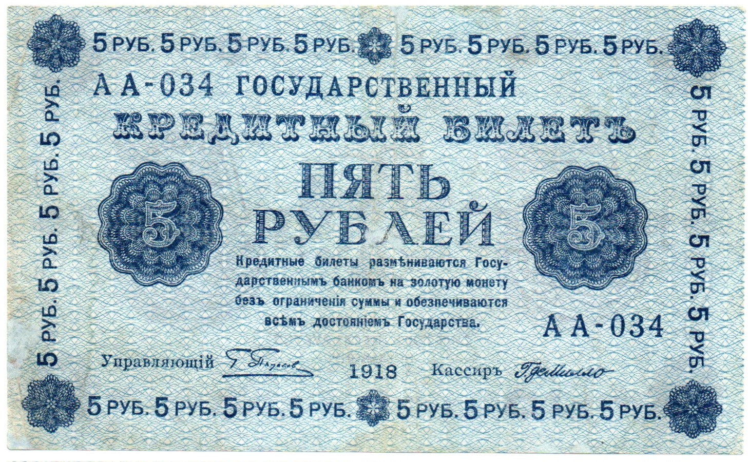 5 рублей 1918 г. Кредитный билет РСФСР. АА-034