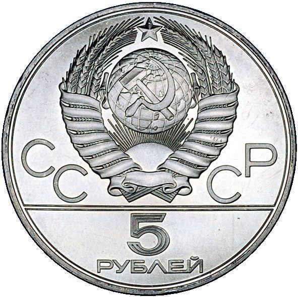 Аверс: сверху герб СССР с 15 витками ленты, слева от него буквы «СС», справа «СР», ниже двойная черта, под ней обозначение достоинства монеты цифра «5» и ниже слово «РУБЛЕЙ».