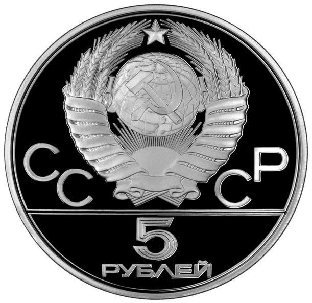 Аверс: сверху герб СССР с 15 витками ленты, слева от него буквы «СС», справа «СР», ниже двойная черта, под ней обозначение достоинства монеты цифра «5» и ниже слово «РУБЛЕЙ».