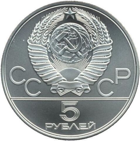 Аверс: сверху герб СССР с 15 витками ленты, слева от него буквы «СС», справа «СР», ниже двойная черта, под ней обозначение достоинства монеты цифра «5» и ниже слово «РУБЛЕЙ».