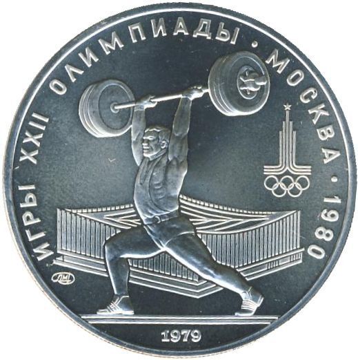 Реверс: слева и сверху вдоль канта слова «ИГРЫ XXII ОЛИМПИАДЫ», справа разделенные точкой слово «МОСКВА» и год проведения XXII Олимпиады «1980», в середине атлет, поднимающий штангу, за ним спортивный зал тяжелой атлетики, справа эмблема XXII Олимпийских игр, слева монограмма монетного двора, внизу у канта год выпуска монеты «1979».