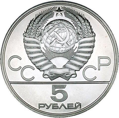 Аверс: сверху герб СССР с 15 витками ленты, слева от него буквы «СС», справа «СР», ниже двойная черта, под ней обозначение достоинства монеты цифра «5» и ниже слово «РУБЛЕЙ».