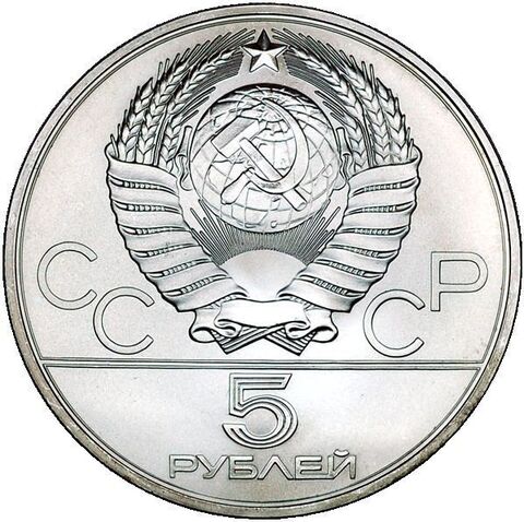 Аверс: сверху герб СССР с 15 витками ленты, слева от него буквы «СС», справа «СР», ниже двойная черта, под ней обозначение достоинства монеты цифра «5» и ниже слово «РУБЛЕЙ».
