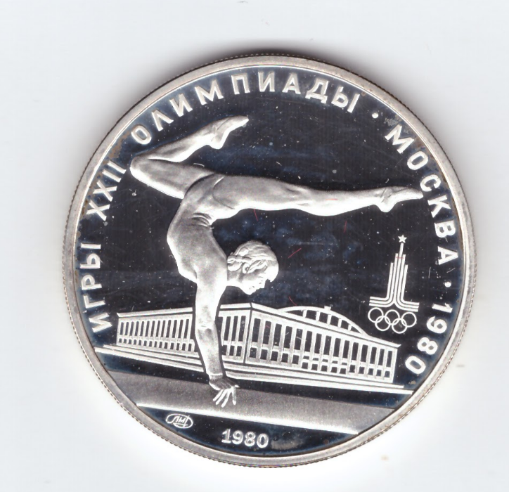 Реверс: слева и сверху вдоль канта слова «ИГРЫ XXII ОЛИМПИАДЫ», справа разделенные точкой слово «МОСКВА» и год проведения XXII Олимпиады «1980», в середине гимнастка, выполняющая акробатический элемент, за ней Ледовый дворец стадиона им. В.И. Ленина (Лужники), справа эмблема XXII Олимпийских игр, внизу у канта слева монограмма монетного двора, справа год выпуска монеты «1980».