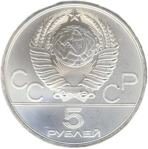 Аверс: сверху герб СССР с 15 витками ленты, слева от него буквы «СС», справа «СР», ниже двойная черта, под ней обозначение достоинства монеты цифра «5» и ниже слово «РУБЛЕЙ».