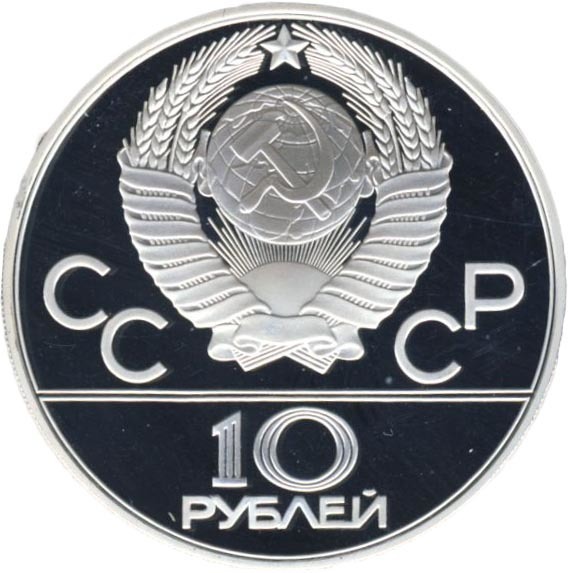 Аверс: сверху герб СССР с 15 витками ленты, слева от него буквы «СС», справа «СР», ниже двойная черта, под ней обозначение достоинства монеты цифра «10» и ниже слово «РУБЛЕЙ».