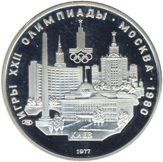 Реверс: слева и сверху вдоль канта слова «ИГРЫ XXII ОЛИМПИАДЫ», справа разделенные точкой слово «МОСКВА» и год проведения XXII Олимпиады «1980», вверху эмблема XXII Олимпийских игр, в середине панорама Киева, внизу у канта год выпуска монеты «1977».