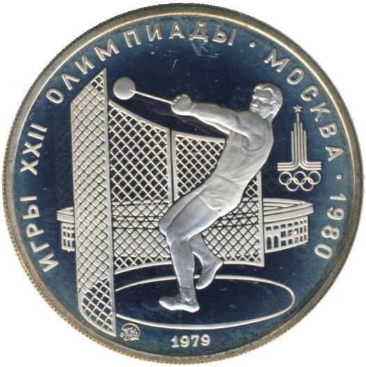 Реверс: слева и сверху вдоль канта слова «ИГРЫ XXII ОЛИМПИАДЫ», справа разделенные точкой слово «МОСКВА» и год проведения XXII Олимпиады «1980», в середине атлет в секторе для метания молота, за ним стадион им. В.И. Ленина (Лужники), справа эмблема XXII Олимпийских игр, внизу у канта слева монограмма монетного двора, справа год выпуска монеты «1979».