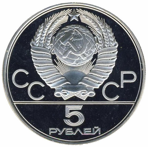 Аверс: сверху герб СССР с 15 витками ленты, слева от него буквы «СС», справа «СР», ниже двойная черта, под ней обозначение достоинства монеты цифра «5» и ниже слово «РУБЛЕЙ».