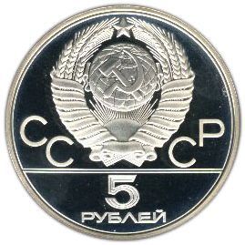 Аверс: сверху герб СССР с 15 витками ленты, слева от него буквы «СС», справа «СР», ниже двойная черта, под ней обозначение достоинства монеты цифра «5» и ниже слово «РУБЛЕЙ».