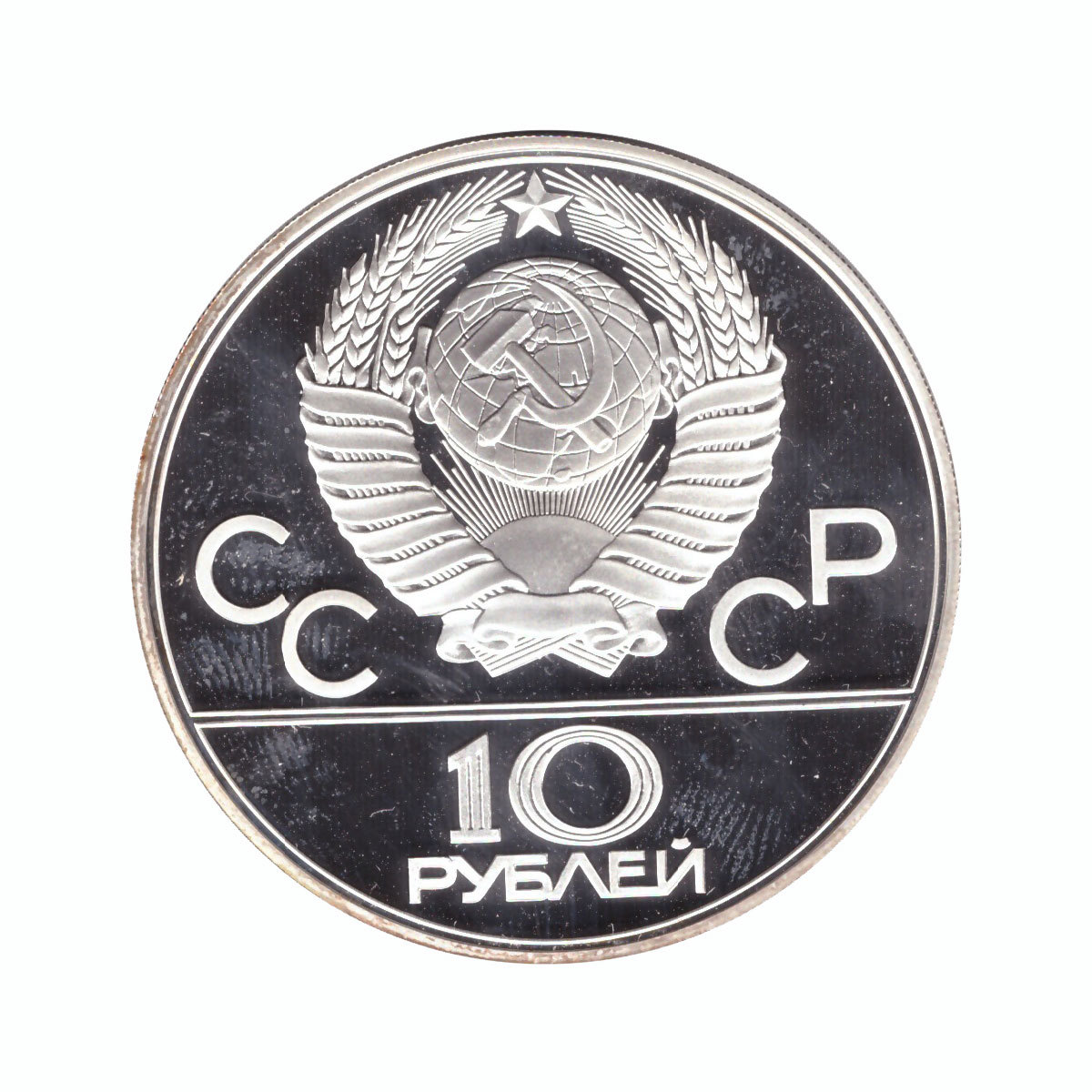 Аверс: сверху герб СССР с 15 витками ленты, слева от него буквы «СС», справа «СР», ниже двойная черта, под ней обозначение достоинства монеты цифра «10» и ниже слово «РУБЛЕЙ».