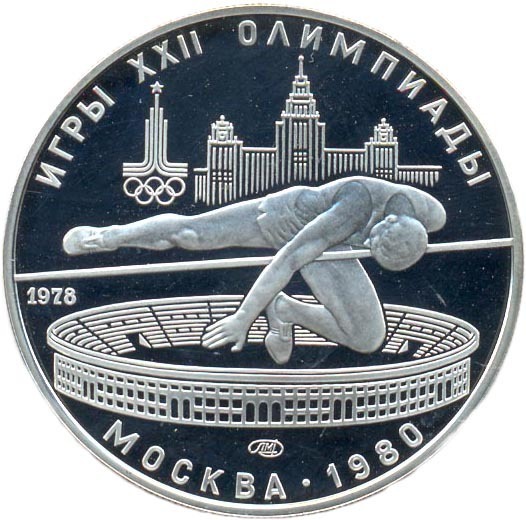 Реверс: сверху вдоль канта слова «ИГРЫ XXII ОЛИМПИАДЫ», ниже слева год выпуска монеты «1978» и эмблема XXII Олимпийских игр, в середине прыгун в высоту, за ним сверху здание МГУ им. Ломоносова, снизу стадион им. В.И. Ленина (Лужники), под стадионом монограмма монетного двора «ЛМД», внизу у края монеты разделенные точкой слово «МОСКВА» и год проведения XXII Олимпиады «1980».