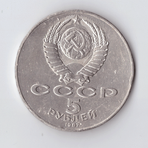 5 рублей 1987 года 70 лет Великой Октябрьской Социалистической революции (Шайба). Есть забоинки на гурте XF- №3