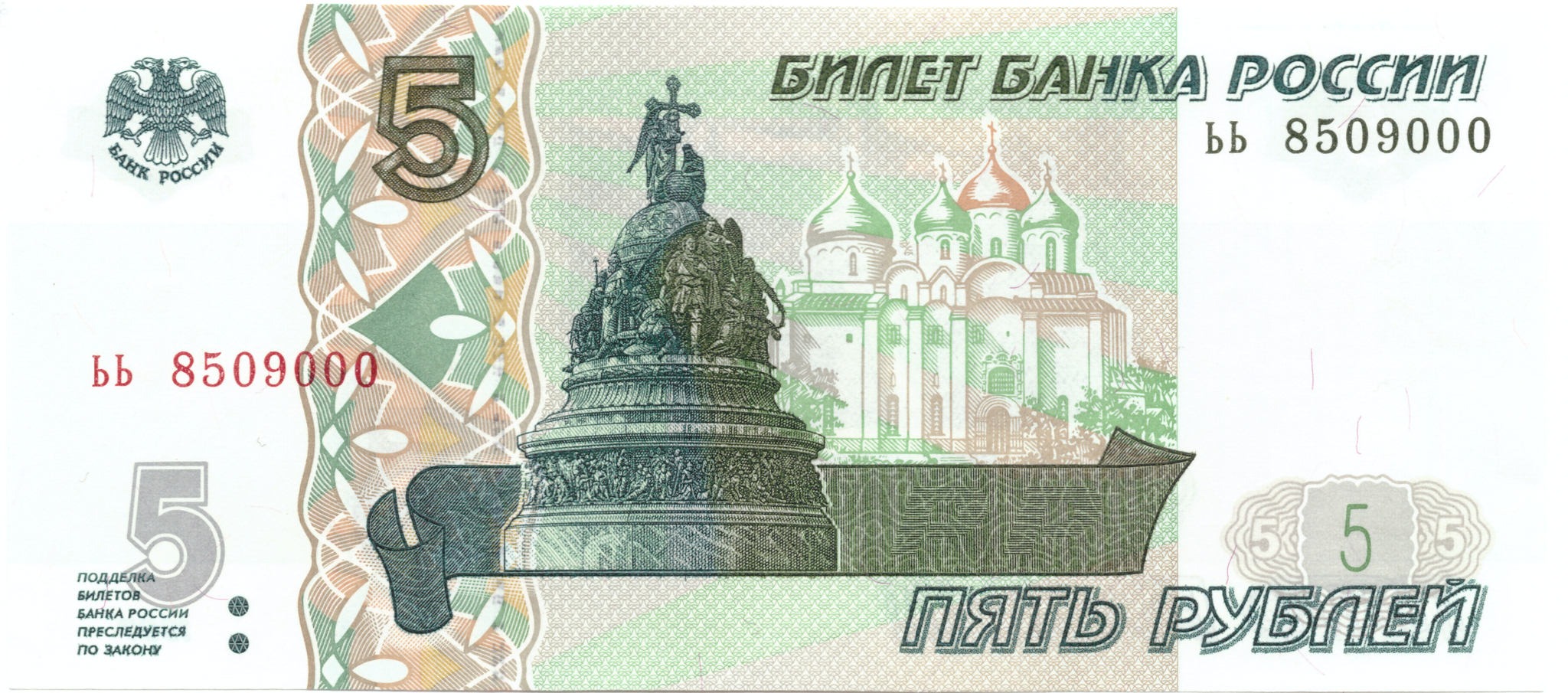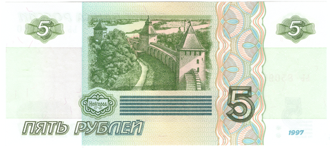 5 рублей 1997 банкнота UNC пресс Красивый номер ЬЬ ***000