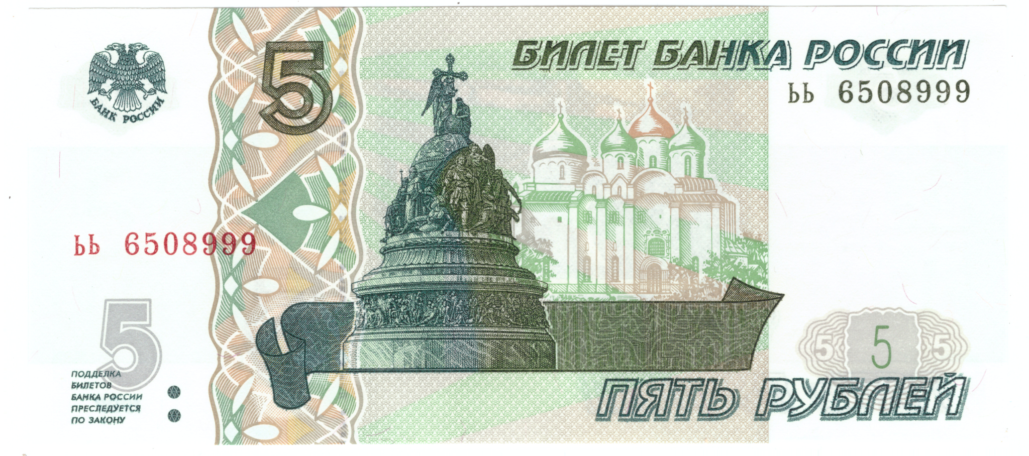 5 рублей 1997 банкнота UNC пресс Красивый номер ьь ***999