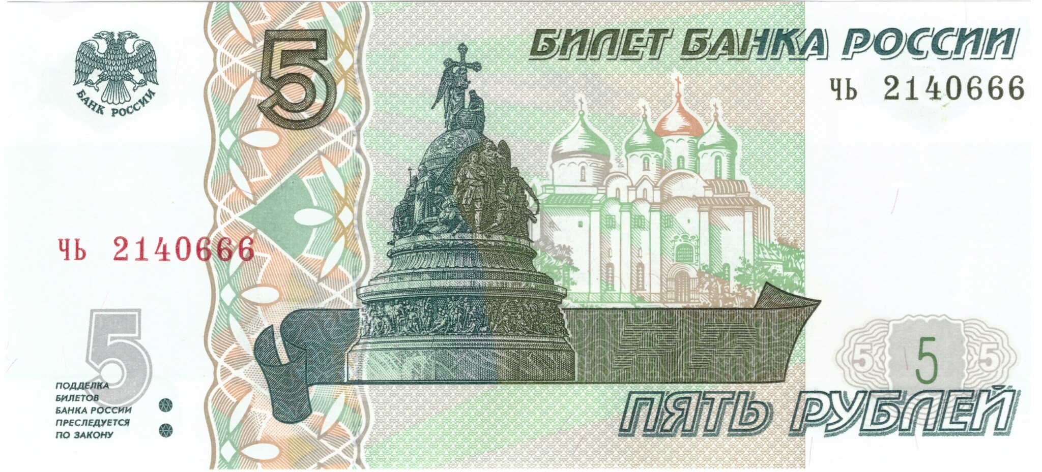 5 рублей 1997 банкнота UNC пресс Красивый номер ЧЬ ***666
