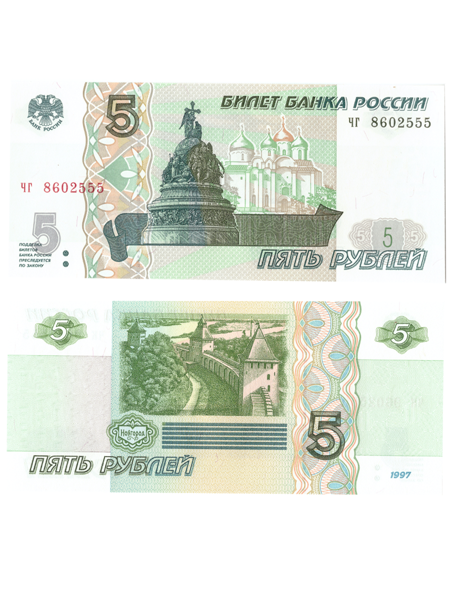 5 рублей 1997 банкнота UNC пресс Красивый номер чг ****555