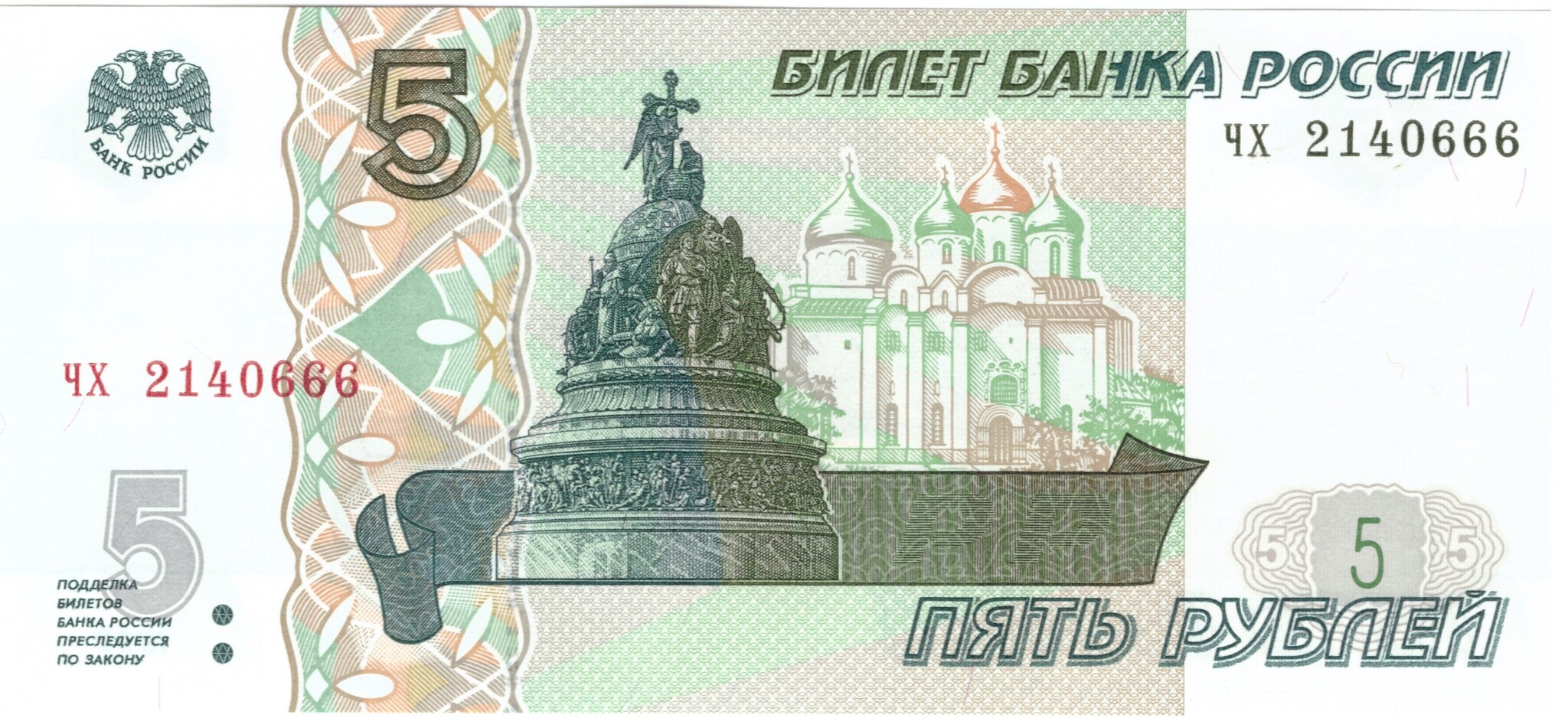 5 рублей 1997 банкнота UNC пресс Красивый номер ЧХ ***666