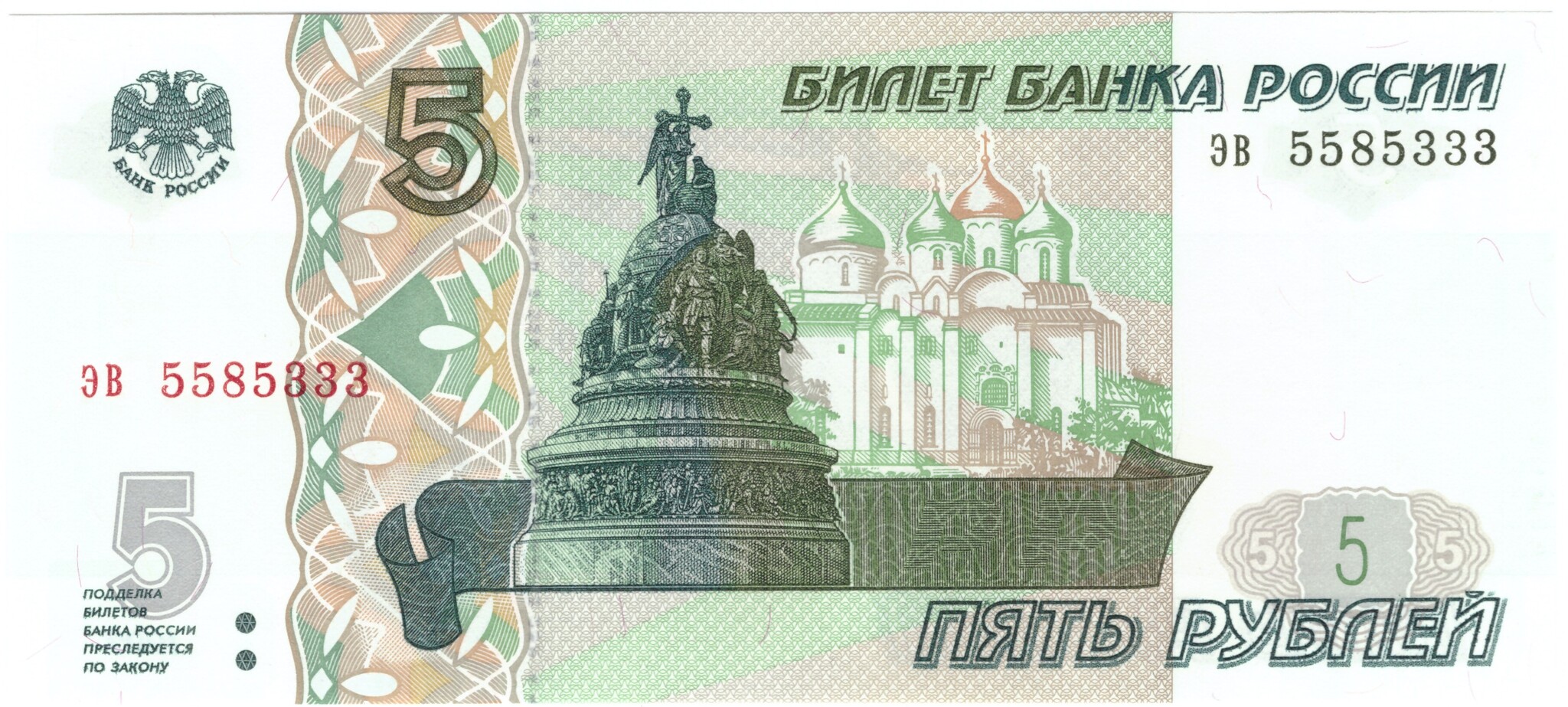 5 рублей 1997 банкнота UNC пресс Красивый номер ЭВ ***333