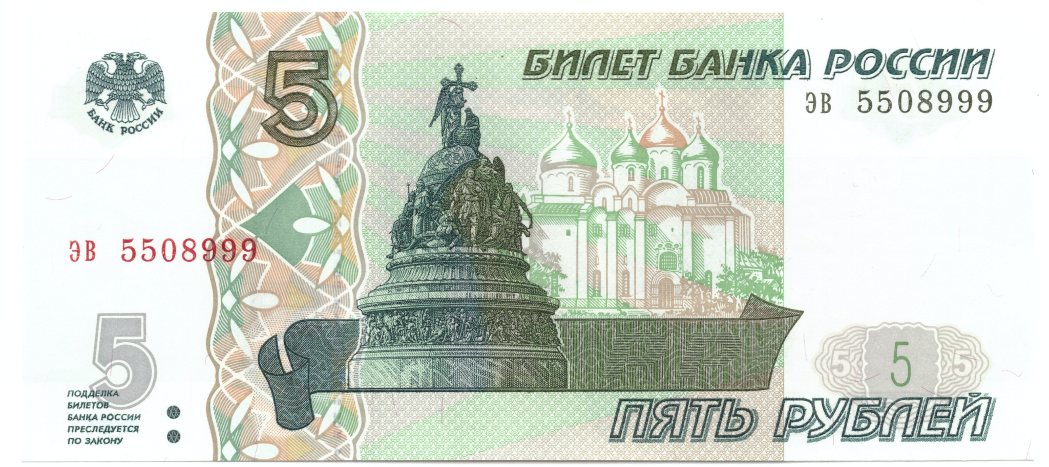 5 рублей 1997 банкнота UNC пресс Красивый номер эв ***999