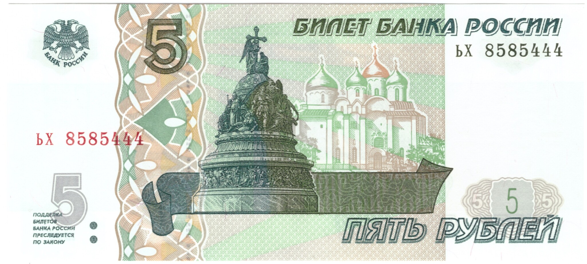5 рублей 1997 банкнота UNC пресс Красивый номер ЬХ 8585444
