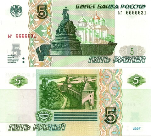 5 рублей 1997 г. Красивый номер ЬГ 6666631. Пресс UNC