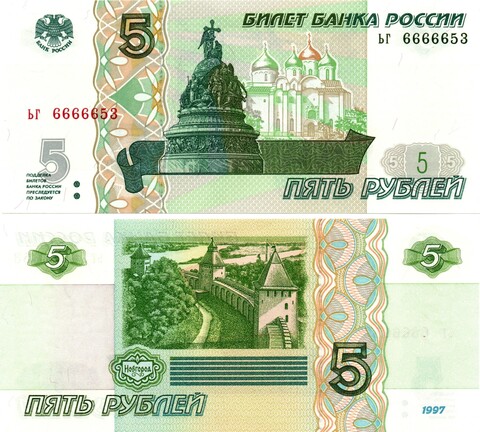 5 рублей 1997 г. Красивый номер ЬГ 6666653. Пресс UNC