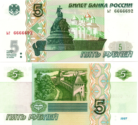5 рублей 1997 г. Красивый номер ЬГ 6666692. Пресс UNC