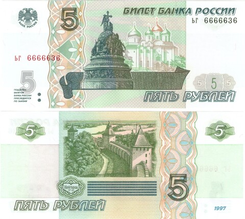 5 рублей 1997 год ЬГ 6666636 Красивый номер Пресс UNC