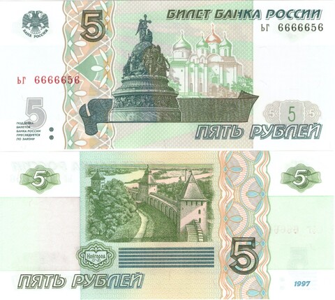 5 рублей 1997 год ЬГ 6666656 Красивый номер Пресс UNC