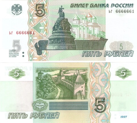 5 рублей 1997 год ЬГ 6666661 Красивый номер Пресс UNC