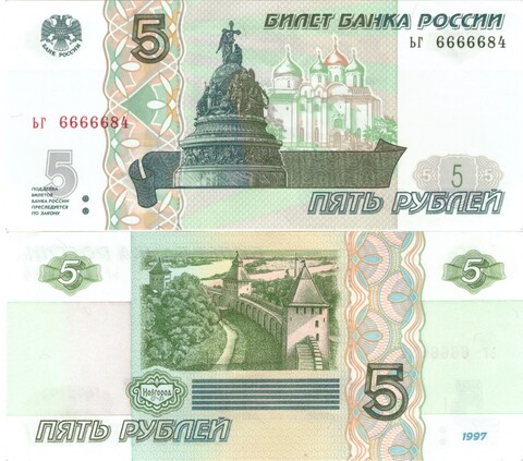 5 рублей 1997 год ЬГ 6666684 Красивый номер Пресс UNC