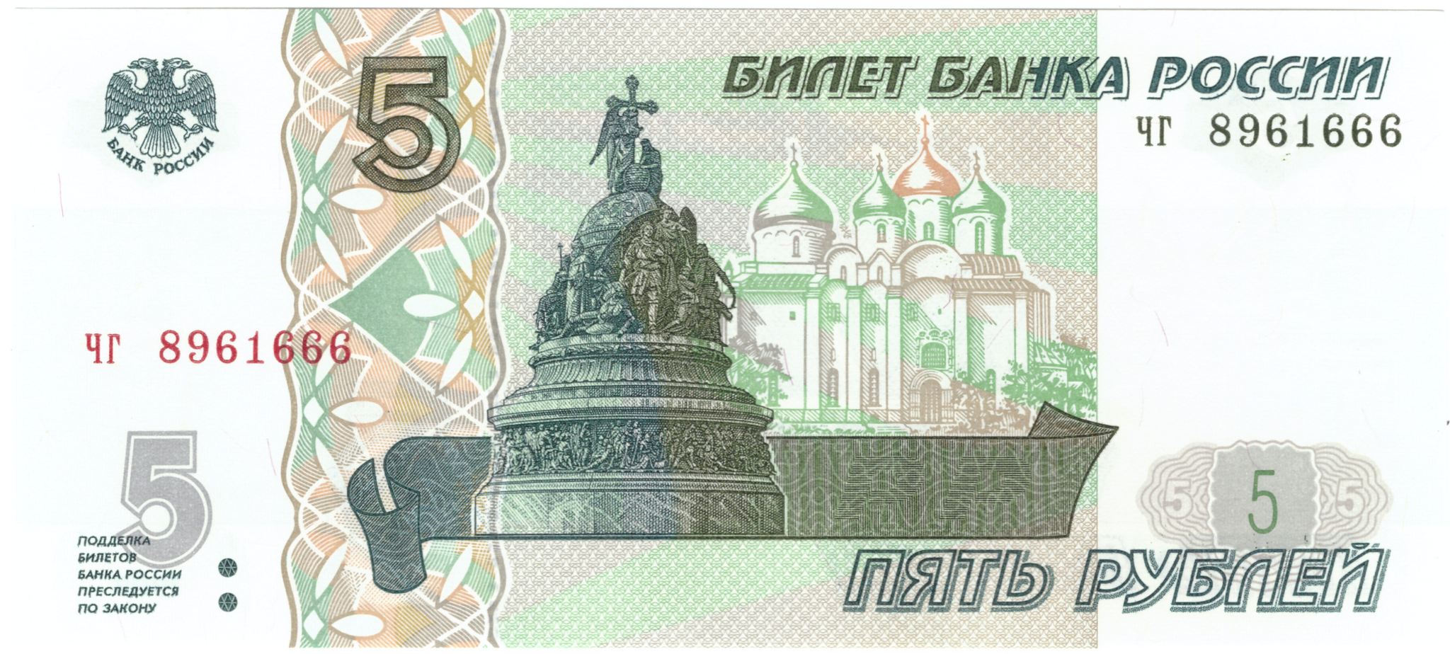5 рублей 1997 год Пресс UNC красивый номер чг ***666