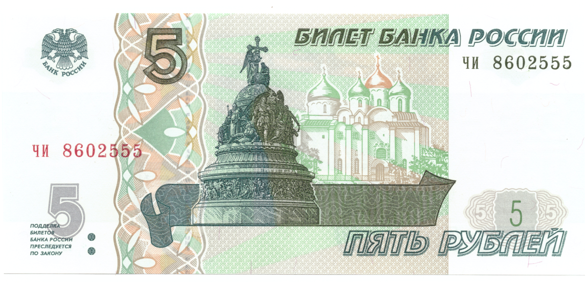 5 рублей 1997 пресс UNC красивый номер ЧИ ***555