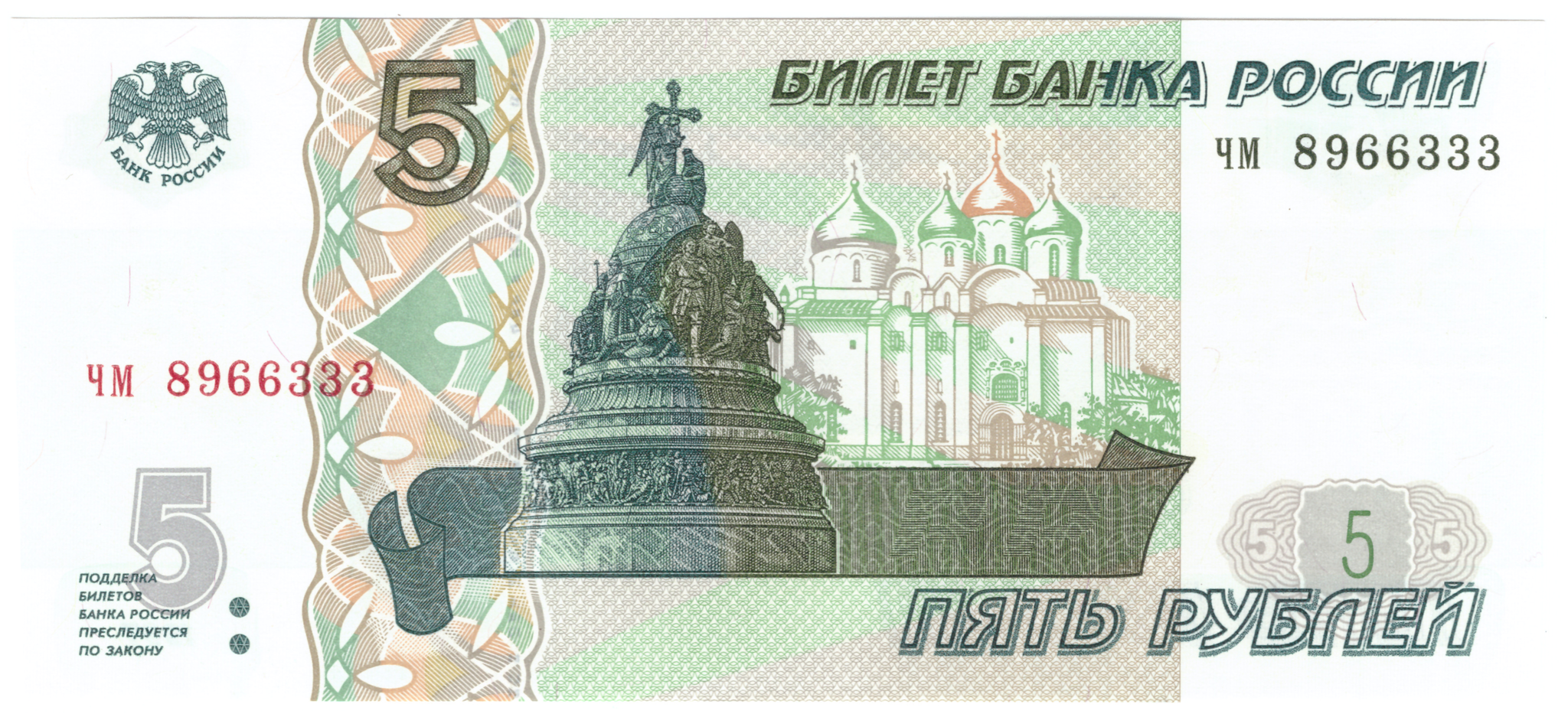 5 рублей 1997 пресс UNC красивый номер чм ***333