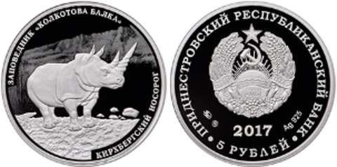 5 рублей 2017 год. Кирхбергский носорог. Заповедник Колкотова балка. Приднестровье. Серебро