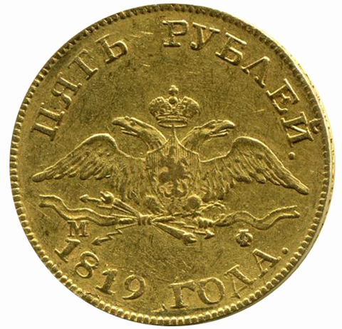 Аверс: по краю монеты ободок из точек, в центре двуглавый орел с крыльями, опущенными вниз, над головами императорская корона, на груди орла Московский герб с Георгием Победоносцем, поражающим дракона копьем, на коне повернутом вправо. Слева в когтях орла факел, горящий с обеих сторон, четыре стрелы-молнии и часть ленты, справа в когтях – лавровый венок и вторая часть ленты, под ней слева и справа инициалы минцмейстера «МФ» (Михаил Федоров). Сверху над орлом круговая надпись «ПЯТЬ РУБЛЕЙ.», под ним год выпуска монеты «1819 ГОДА.».