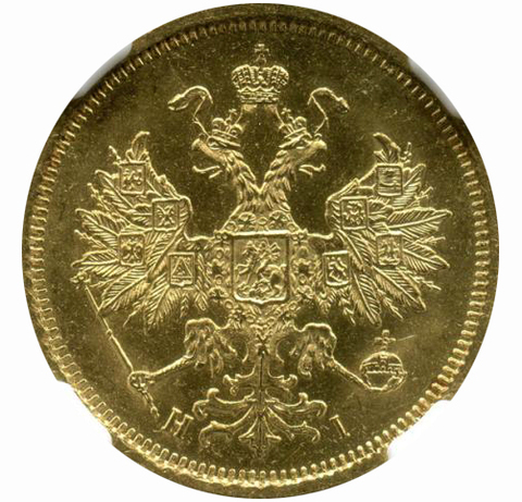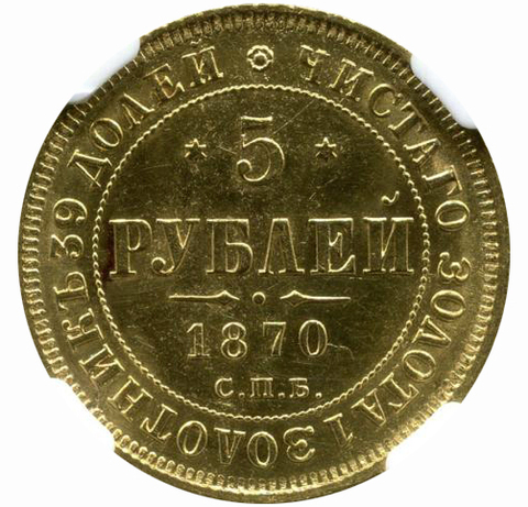 Реверс:вдоль края монеты разделенная вверху розеткой надпись «ЧИСТОГО ЗОЛОТА 1 ЗОЛОТНИК 39 ДОЛЕЙ», в середине в точечном ободке обозначение номинала цифра «5», слева и справа звездочки, ниже слово «РУБЛЕЙ», под ним две направленные в разные стороны фигурные черты, ниже год выпуска монеты «1870», под ним обозначение монетного двора «СПБ».