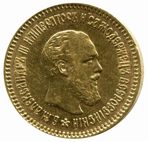 Реверс: В центре изображен Малый Государственный Герб Российской империи - двуглавый орёл, головы которого увенчаны двумя коронами, третья, большая корона над ними. Все они соединены орденской лентой ордена Св. апостола Андрея Первозванного. На груди орла расположен Московский герб - щит с изображением Георгия Победоносца с копьём поражающего дракона. Вокруг щита цепь ордена Св. апостола Андрея Первозванного. На крыльях изображены гербы: Царства Казанского, Польского, Херсонеса Таврического, Астраханского, Сибирского, Грузинского и герб соединенных княжеств Киевского, Новгородского и Владимирского — по 4 на каждое крыло. В правой лапе орла – скипетр, в левой – держава. Под ним слева направо изображены: номинал - надпись «5 РУБЛЕЙ» и дата выпуска «1889 Г.». По окружности канта имеются рельефные элементы, выполненные в виде зубцов.