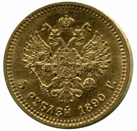 Аверс: в середине Малый Государственный Герб Российской империи, под ним вдоль края монеты номинал «5 РУБЛЕЙ» и год выпуска монеты «1890 Г.».