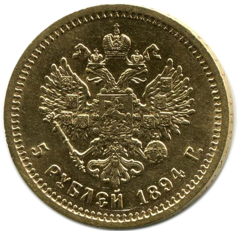 Аверс: в середине Малый Государственный Герб Российской империи, под ним вдоль края монеты номинал «5 РУБЛЕЙ» и год выпуска монеты «1894 Г.».