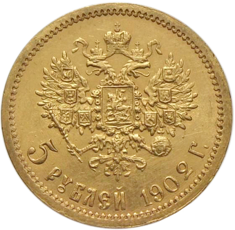 Аверс: в середине Малый Государственный Герб Российской империи, под ним вдоль края монеты номинал «5 РУБЛЕЙ» и год выпуска монеты «1902 Г.».