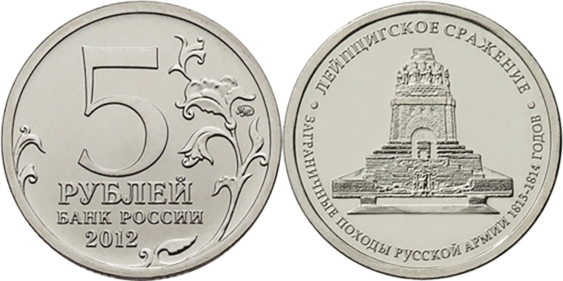 Монета выпущена в 2012 году в честь 200-летия победы в Отечественной Войне 1812 Центральным Банком РФ. Входит в серию из 10 монет под названием «Сражения и знаменательные события Отечественной войны 1812 года и заграничных походов русской армии 1813-1814 годов». На реверсе изображен Памятник битве народов, расположенный в Лейпциге, названный так потому, что в сражении против французов участвовали в союзе русские, австрийцы, пруссаки и шведы.