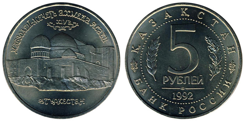 5 рублей Мавзолей - мечеть Ахмеда Ясави в Туркестане 1992 год АЦ