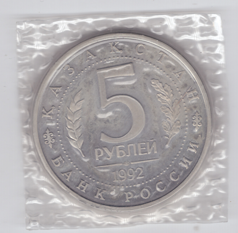 Аверс: в центре диска - надпись в две строки: "5 Рублей", слева и справа от неё - лавровая и дубовая ветви, под словом "Рублей", в центре прерывистой линии - товарный знак монетного двора, ниже - дата "1992". По окружности - надписи, обрамлённые кругом из точек и разделённые орнаментом: вверху - "Казакстан" (название на казахском языке Республики Казахстан), внизу - "Банк России".