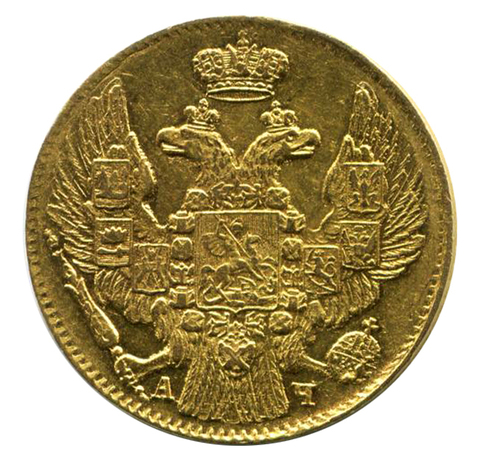 Реверс: вдоль края монеты разделенная вверху розеткой надпись «ЧИСТОГО ЗОЛОТА 1 ЗОЛОТНИК 39 ДОЛЕЙ», в середине в точечном ободке обозначение номинала цифра «5», слева и справа звездочки, ниже слово «РУБЛЕЙ», под ним две направленные в разные стороны фигурные черты, ниже год выпуска монеты «1842», под ним обозначение монетного двора «СПБ».