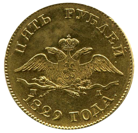 Аверс: по краю монеты ободок из точек, в центре двуглавый орел с крыльями, опущенными вниз, над головами императорская корона, на груди орла Московский герб с Георгием Победоносцем, поражающим дракона копьем, на коне повернутом вправо. Слева в когтях орла факел, горящий с обеих сторон, четыре стрелы-молнии и часть ленты, справа в когтях – лавровый венок и вторая часть ленты, под ней слева инициал минцмейстера «П», справа «Д» (Павел Данилов). Сверху над орлом круговая надпись «ПЯТЬ РУБЛЕЙ.», под ним год выпуска монеты «1829 ГОДА.».